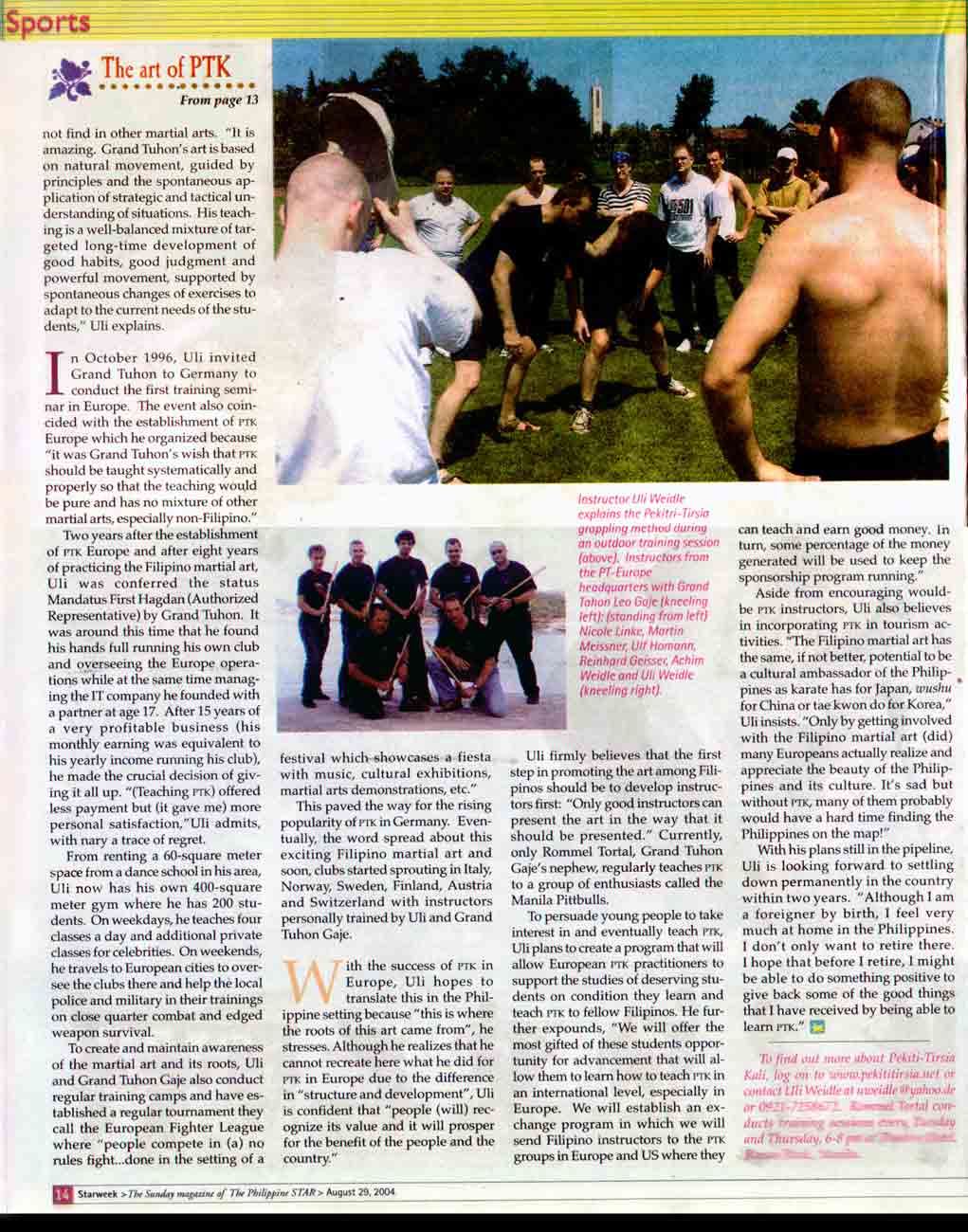 A three full pages article about Filipino Martial Art, with a special emphasis on the Pekiti-Tirsia Filipino Martial Arts System and its propagation in Europe, was published on August 29, 2004 nationwide in the Philippines »Starweek« Magazine.